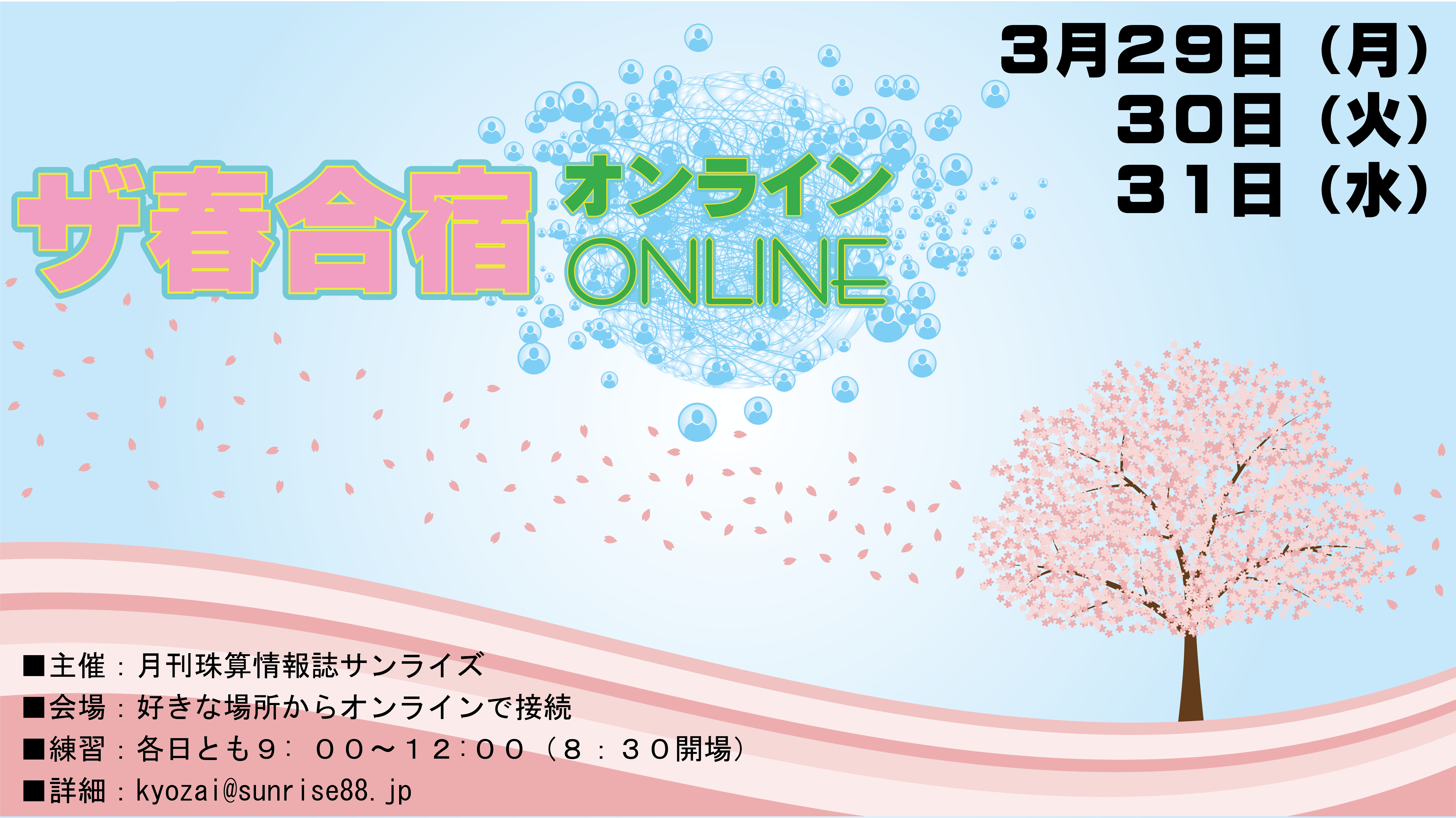 | 申 込 | エクセルファイルをダウンロードし、必要事項を入力の上、 kyozai@sunrise88.jp までお申し込みください。費用の入金確認後、練習問題をPDF添付し返信します。 ※問題送付後の返金はできません。接続不良で参加できない場合も同様です。 |
