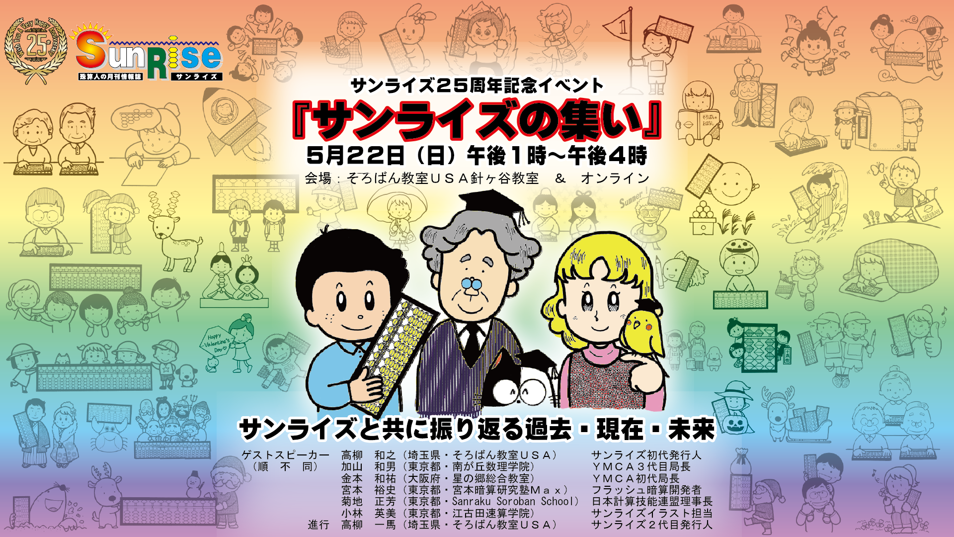 高柳 和之(埼玉県・そろばん教室USA)サンライズ初代発行人 加山 和男(東京都・南が丘数理学院)YMCA3代目局長 金本 和祐(大阪府・星の郷総合教室)YMCA初代局長 宮本 裕史(東京都・宮本暗算研究塾Max)フラッシュ暗算開発者 菊地 正芳(東京都・Sanraku Soroban School)日本計算技能連盟理事長 小林 英美(東京都・江古田速算学院)サンライズイラスト担当 進行 高柳 一馬(埼玉県・そろばん教室USA)サンライズ2代目発行人 |